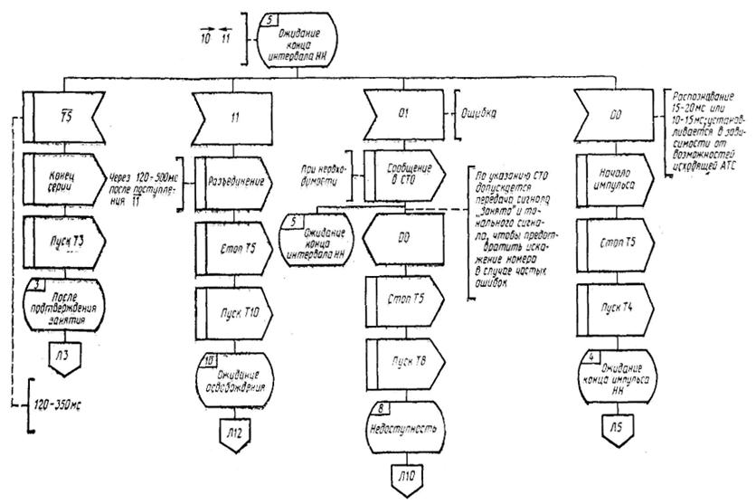 Учитывая возможность работы с исходящими АТС, передающими декадные импульсы набора номера вслед за занятием, время подготовки к приему этих импульсов должно быть не более 70 мс. В случае поступления первого импульса до готовности к приему в сторону исходящей АТС должен быть передан отказ в виде линейного сигнала «Занято» и тонального сигнала;