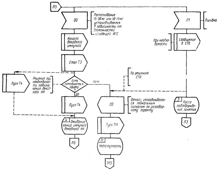 3) время распознавания сигнала «Занятие» определяется скоростью его обработки на входящей АТС в качестве неприоритетного сигнала. Этот вариант может быть использован, если исходящая АТС не передает информацию декадным способом, либо передает такую информацию, только получив подтверждение занятия, а также если входящая АТС готова к приему декадных импульсов набора одновременно с занятием.