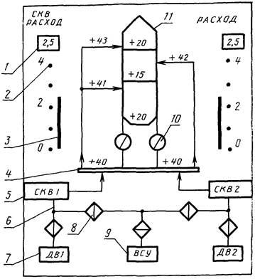 1 - счетчик; 2 - отметки шкалы указателя расхода воздуха; 3 - указатель расхода воздуха; 4 - коллектор; 5 - система кондиционирования воздуха; 6 - магистрали отбора воздуха от двигателя; 7 - двигатель 1; 8 - кран кольцевания; 9 - вспомогательная силовая установка; 10 - вентилятор; 11 - контур кабины; +15, +20, +40, +41, +42, +43 - значения температуры в коллекторе, трубопроводах, салонах; 0, 2, 4 - оцифровка шкалы указателя расхода воздуха