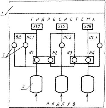 1 - часть экрана для индикации сигнальной информации; 2 - насосы; 3 - баки с гидрожидкостью; ВД - ветродвигатель; НС1, НС2, НС3 - насосные станции; H1, Н2, Н3, Н4 - основные насосы от двигателя; 210, 215, 209 - значения давления в гидросистеме