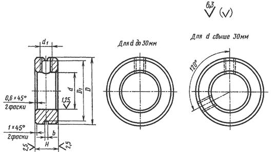 7. Установочные кольца диаметром d = 140 мм и более в целях предохранения установочных винтов от вывинчивания вместо установки пружинных колец должны быть обвязаны проволокой. Узел проволоки закладывают в специально просверленное отверстие диаметром, равным трем диаметрам проволоки, и глубиной не менее половины толщины кольца.