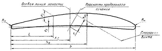 На контурах соответственно указывают: «Проектированный контур», «Спрямленный контур», «Осевая линия лопасти», «Линия наибольших толщин», «Направление вращения» (показывают стрелкой), «Входящая кромка», «Выходящая кромка».