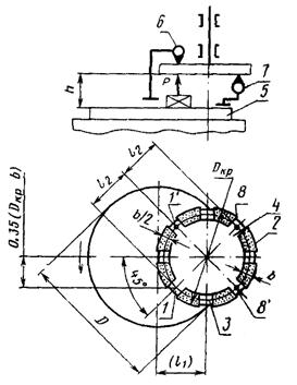 Примечание. При вращении стола, противоположно указанному на черт. 10, нагружающая сила и измерительный наконечник прибора для измерения длин 6 должны находиться на вертикальной прямой, проходящей через точку 1¢, а точка измерения прибора для измерения длин 7 должна занимать положение 8¢.