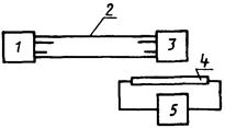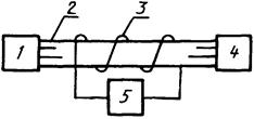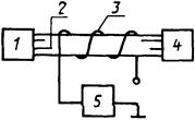 1 - эквивалент источника сигнала по входу и эквивалент нагрузки по выходу; 2 - жгут линии связи; 3 - провод-индуктор; 4 - проверяемая аппаратура; 5 - генератор импульсов