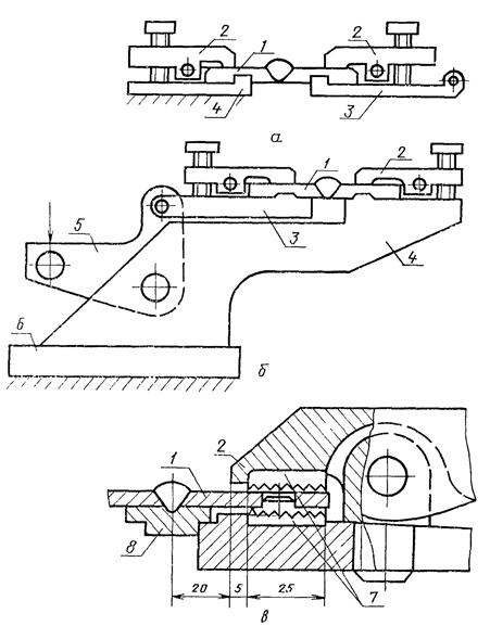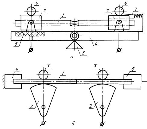 Образцы типа 8 испытывают на растяжение. Для этого машины оснащают приспособлением для трехточечного изгиба (черт. 4а), в котором образец крепится в захватах-токоподводах, закрепленных на шарнирной раме. Изгиб этой рамы производят между опорами пуансоном. Один токоподвод крепится на шарнирной раме через изолятор. Образцы типа 8 испытывают на машинах ЛТП3-5 с горизонтальным перемещением активного захвата (черт. 4б). Образец прижимают к токоподводам прижимами и закрепляют в захватах. Один из захватов связан с механизмом растяжения.