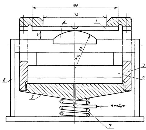 1 - образец; 2 - оправка (сменная); 3 - цилиндр; 4 - поршень; 5 - дно цилиндра; 6 - опора; 7 - пружина возврата