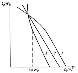 На черт. 1 показаны типичные зависимости lgN - lgW, сходный вид имеют зависимости N и от других параметров механического нагружения.