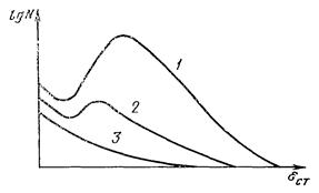 Если утомлению при циклических деформациях подвергаются предварительно статически растянутые образцы, то зависимости N от статической деформации eст имеют вид, показанный на черт 2.