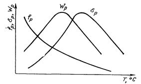 С повышением температуры усталостная прочность и усталостная выносливость меняются сложным образом. Зависимость показателей усталостной прочности fр, eр и Wp от температуры в области до начала стеклования имеют вид, представленный на черт. 3.