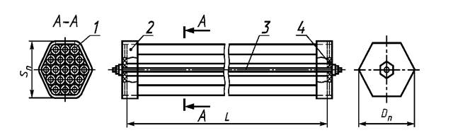 5.1.3. Упаковку труб проводят в пакеты с помощью шестигранных крышек, защищающих торцы пакетов, и специальных шпилек, пропущенных через центральную трубу пакета (черт. 6). Между днищами крышек и торцами труб помещают предохранительные прокладки. Пакеты дополнительно плотно увязывают в одном-двух местах проволокой по ГОСТ 3282-74. Количество труб в одном пакете и ориентировочные размеры пакетов приведены в табл. 5.