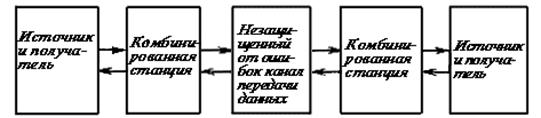 1.1. Балансные процедуры управления звеном ПД определяют синхронную кодонезависимую передачу данных между двумя комбинированными станциями (далее - станциями) звена ПД, соединенными незащищенным от ошибок каналом ПД (НК), как показано на черт. 1. Данные, предназначенные для передачи, поступают в звено ПД извне от источника информации и после правильного приема передаются во вне получателю информации.