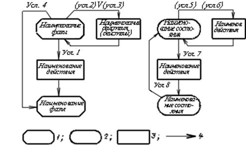 1 - обозначение фазы; 2 - обозначение состояния или субсостояния; 3 - обозначение действия; 4 - обозначение перехода; Усл. Х - условие Х или событие Х