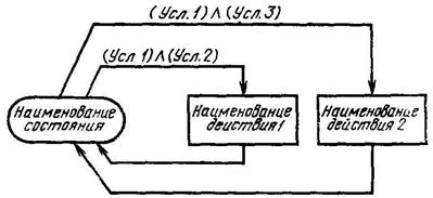 Переход является условным, если над ним записано событие и (или) условие, вызывающее этот переход. Если таких событий и (или) условий несколько, то изображение каждого события заключается в скобки и соединяется друг с другом знаком дизъюнкции или конъюнкции.