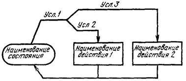 5. Для того чтобы показать, что действие совершается в определенном состоянии, изображение действия или последовательности действий соединяют стрелкой-переходом с изображением соответствующего состояния. Направление стрелки указывает последовательность выполнения элементов процедуры во времени.