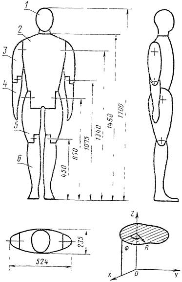 1 - голова с шеей; 2 - туловище; 3 - плечо; 4 - предплечье; 5 - бедро; 6 - голень
