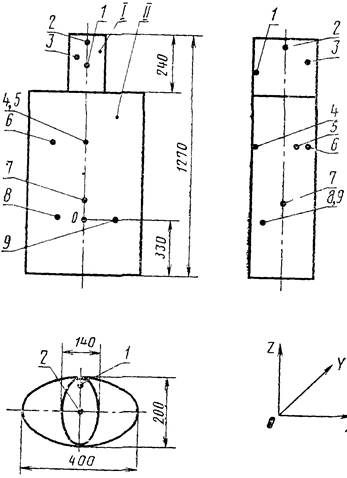 2.2.1. Форма цилиндрического фантома должна выбираться в виде совокупности двух эллиптических цилиндров (части I и II). Форма и размеры фантома должны соответствовать указанным на черт. 8.
