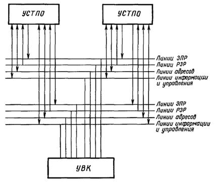 1.1. Стык УВК с УСТПО осуществляют на базе двух или более независимых магистралей передачи информации, состоящих из функциональных линий взаимодействия. Структура подключения УСТПО к УВК на базе двух магистралей показана на черт. 1.
