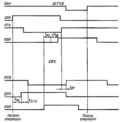 tрл - время распространения сигналов по линиям магистрали от УСТПО до УВК; tПТЗ - время ожидания УВК сброса сигнала ПТЗ с момента прихода ЗПР; tЗУ - задержка сигнала УСТПО при передаче сигнала РЗР последующему устройству; п - число устройств, через которые проходит сигнал РЗР до устройства, выставившего сигнал ЗПР