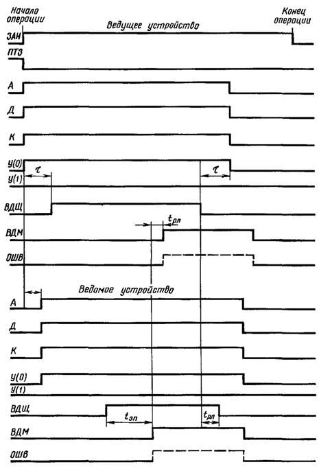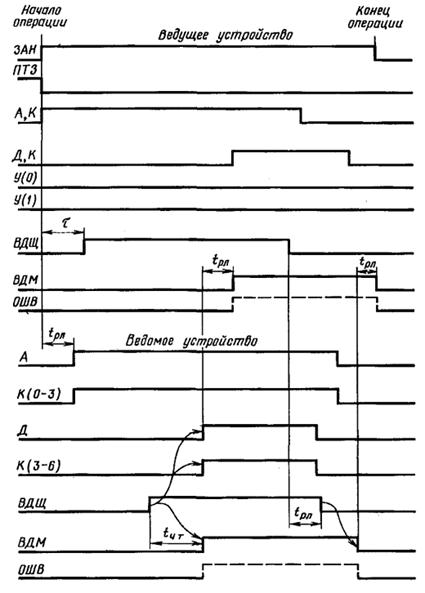 Операция передачи данных продолжается с момента установки ведущим устройством сигнала на линии ВДЩ или ПРЕР до сброса ведомым устройством сигнала на линии ВДМ.
