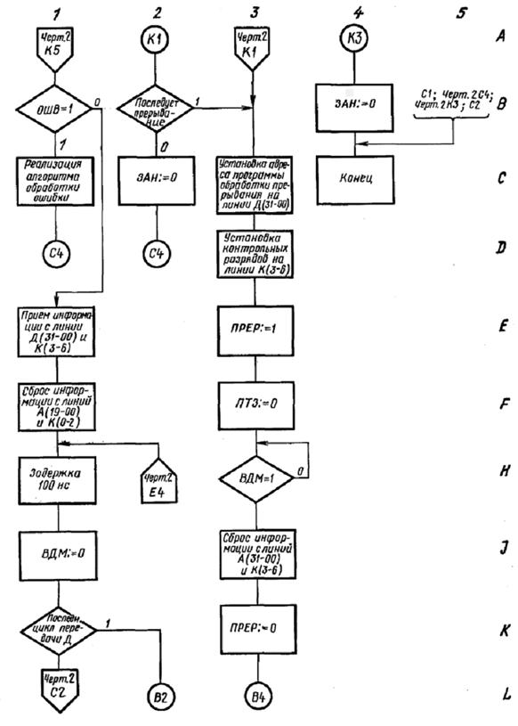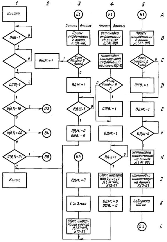 - ведомое устройство, опознавшее свой адрес и обнаружившее сигналы на линиях ВДЩ и У (0, 1), осуществляет прием информации с линий Д (31-00) и К (0-6), после чего устанавливает сигнал на линию ВДМ. На линию ОШВ ведомое устройство устанавливает сигнал совместно с сигналом на линию ВДМ, если в принятой от ведущего устройства информации или адресе обнаружена ошибка по четности;