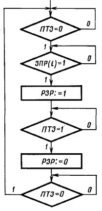 5.2. При реализации алгоритма передачи управления магистралью УВК (при отсутствии сигнала на линии ПТЗ) осуществляет анализ наличия сигналов на линиях ЗПР. При обнаружении сигнала на одной из линий ЗПР, УВК формирует сигнал на соответствующей линии РЗР, тем самым разрешая УСТПО, выставившему запрос, захватить магистраль при отсутствии сигнала на линии ЗАН. Алгоритм передачи управления, реализуемый УВК, показан на черт. 5.