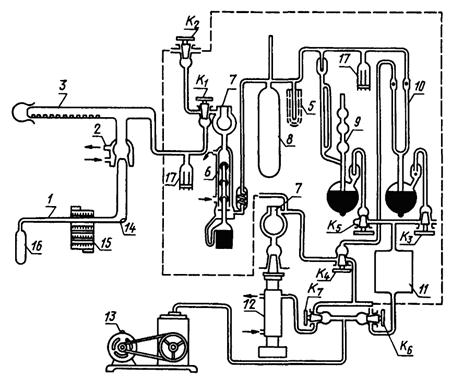 4.10. Кран K1 соединяют с аналитической системой, опускают ртуть в затворе 10 и создают в аналитической системе высокий вакуум.