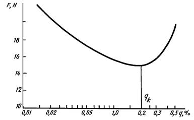 3.8. При форсировании с использованием абразивного материала рекомендуется определять его предельно допустимую концентрацию в смазочном материале как значение, при превышении которого возрастает стабилизированный коэффициент трения (см. чертеж). При этом давление и температуру смазочного масла определяют в соответствии с п. 3.7.