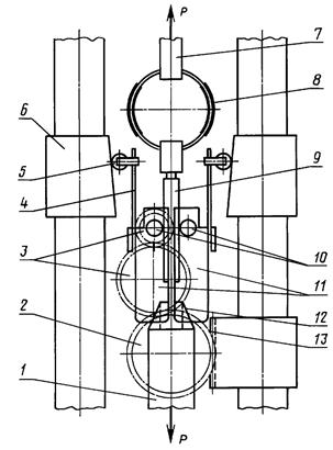 2.3. Испытательный прибор устанавливают на подвижной траверсе разрывной машины, отвечающей требованиям ГОСТ 28840-90. В соответствии с чертежом приложения 1 образец, установленный между контробразцами, закрепляют на ее неподвижной траверсе.