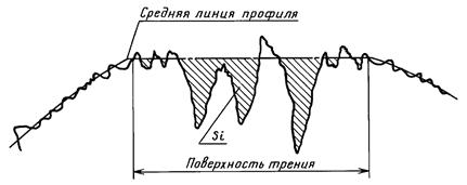 3.2.4.2. По профилограммам, снятым по п. 3.2.3, определяют площадь Si поперечного сечения царапин с погрешностью не более 10 %, определяемую как площадь поверхности, ограниченной профилем поверхности образца и средней линией микронеровностей по ГОСТ 2789-73, проведенной по участкам профиля поверхности без задира. Вычисление площади сечения царапин и выбор исследуемого участка поверхности иллюстрированы черт. 2 приложения 2.