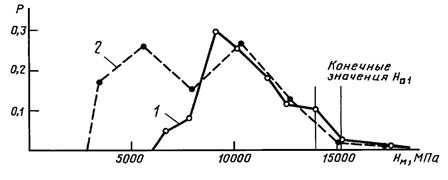 Количество повторных измерений микротвердости наростов - не менее 50. По результатам измерения микротвердости строят статистический ряд, содержащий 7 - 10 разрядов значений микротвердости. Значение Н□1 оценивают по величине разряда в области максимальных значений микротвердости, частота наблюдений которого не менее 0,05. Образец гистограммы плотности распределения микротвердости для стали 45 изображен на черт. 3 приложения 2.