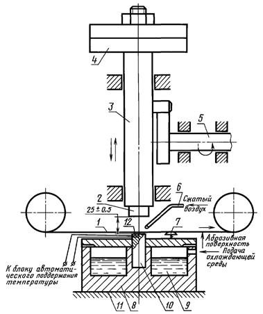 Интенсивность и объем подачи охлаждающей среды регулируют блоком автоматического поддержания температуры, управляемым сигналом, поступающим от термопары 12, закрепленной в отверстии, выполненном на расстоянии 1,5 мм от испытуемого торца образца (рабочая поверхность). Схема и описание блока автоматического поддержания температуры приведены в приложении 1.