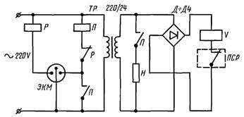 При работе блока ток через систему контактов магнитного пускателя П, электроконтактного манометра ЭКМ и реле Р поступает на спираль нагревателя Н, установленного в сосуде Дьюара. Испаряясь, азот создает автоматически поддерживаемое ЭКМ избыточное давление от 30 до 40 кПа, под действием которого охлаждающая среда по системе трубопроводов поступает через магнитный клапан V в охлаждающую камеру. Регулирование частоты и интенсивности подачи охлаждающей среды с помощью клапана V и контроль температуры образца с одновременной ее записью на диаграммной ленте осуществляются потенциометром типа ПСР, соединенным с установленной в образце термопарой. Для обеспечения безопасности работы в случае превышения давления в сосуде Дьюара свыше 50 кПа должен быть предусмотрен сброс давления через аварийный клапан.