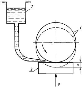 1 - испытуемый образец (ролик); 2 - неподвижный эталонный образец; 3 - резервуар со смазочным маслом