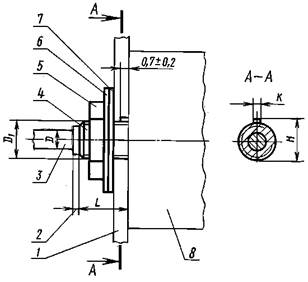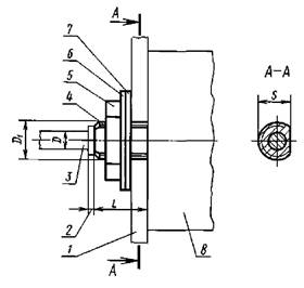 1 - монтажная панель; 2 - стопорный элемент = 1,5 max; 3 - конец вала; 4 - втулка; 5 - гайка; 6 - шайба по ГОСТ 10462-81; 7 - шайба по ГОСТ 10450-78; 8 - корпус изделия