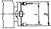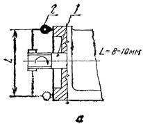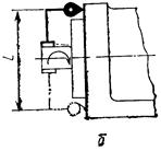 Измерительный прибор 2 укрепляют на конце шпинделя 1 (а - для бабок с пинолью; б - для бабок без пиноли) так, чтобы его измерительный наконечник касался плоскости для крепления привода на расстоянии 0,5L от оси шпинделя и был перпендикулярен к этой плоскости.
