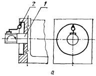 Измерительный прибор 2 укрепляют на конце шпинделя 1 так, чтобы его измерительный наконечник касался цилиндрической поверхности (а - для бабок с пинолью, б - для бабок без пиноли) под привод и был направлен к его (от ее) оси перпендикулярно к образующей.