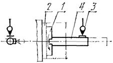 Контрольную оправку 4 устанавливают вдоль оси шпинделя 1. Измерительный прибор 3 устанавливают так, чтобы его плоский измерительный наконечник касался цилиндрической поверхности оправки и был направлен к ее оси перпендикулярно к образующей.