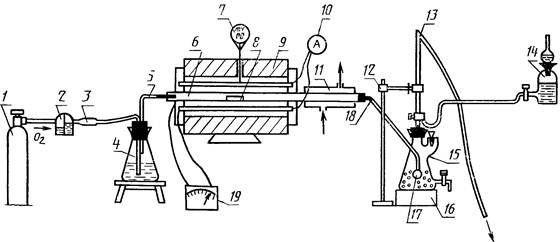 Установка для определения массовой доли фтористого кальция (рисунок 1) состоит из баллона с кислородом 1, снабженного редукционным вентилем; промывной склянки для очистки кислорода 2, заполненной раствором гидроокиси натрия с массовой концентрацией 200 г/дм3; шарообразной трубки 3, заполненной ватой и служащей для улавливания гидроокиси, уносимой кислородом; колбы 4 для получения пара; трубки 5 (из нержавеющей стали или латуни) с внутренним диаметром 1,2 - 1,5 мм, соединяющейся резиновой пробкой с кварцевой трубкой 6 с внутренним диаметром 20 - 22 мм, длиной 550 мм; платино-платинородиевой термопары 7, подключенной к автоматическому потенциометру типа КСП-2; фарфоровой лодочки 8 № 2-9 по ГОСТ 9147 (перед применением лодочку прокаливают при рабочей температуре в течение 4 - 5 мин); двухтрубчатой печи 9 с силитовыми нагревателями, обеспечивающими нагревание до температуры 1350 °С (печь должна иметь наклон 3 - 4° в сторону приемника); амперметра 10 со шкалой 50 А для контроля силы тока нагревателя; холодильника 11; держателя 12; бюретки 13 с автоматическим нулем, склянки 14 с титрованным раствором гидроокиси натрия; поглотительного сосуда 15; магнитной мешалки 16; барботера 17; шлифа M14 18, соединяющего кварцевую трубку с барботером; автотрансформатора 19 типа РНО-250-10.