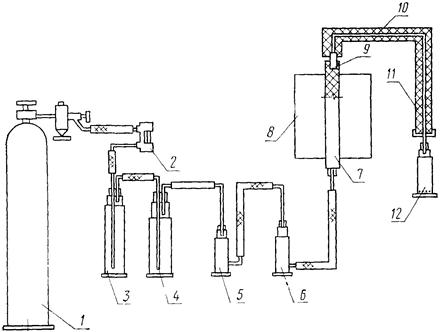 Установка для определения влаги (черт. 1) состоит из баллона с кислородом (1) по ГОСТ 5583, снабженного редукционным вентилем пуска и регулировки тока кислорода; редуктора манометра (2) - тонкой регулировки кислорода; предохранительной колбы (3), которая в случае избыточного давления в камере сгорания предотвращает попадание серной кислоты в резиновые трубки, соединяющие аппарат с редукционным клапаном; системы очистки и осушки кислорода; промывочной колбы (4) с серной кислотой; сушильных колонок (5) и (6), заполненных гранулированной гидроокисью натрия и перхлоратом магния; фарфоровой трубки (7) длиной 500 мм и внутренним диаметром 20 - 25 мм; трубчатой печи (8) марки СУОЛ-0,25-1/12-М1; асбестовой пробки (9), пропитанной монооксидом свинца, нагретой до температуры 800 °С; медной трубки (10), нагретой до температуры 110 - 120 °С; Г-образного трубопровода (11); абсорбционной колбы (12) с перхлоратом магния (ангидроном). Г-образный трубопровод изготовлен из аустенитной нержавеющей стали и состоит из двух симметричных разъемных частей, общая длина трубопровода 750 мм. Спиральный нагреватель располагают вокруг и вдоль изогнутой по профилю трубопровода медной трубки, одновременно изолируя витки нагревателя асбестовым шнуром ШАОН-3, пропитанным жидким стеклом. Трубку с нагревателем оплетают лентой из фторопласта и укладывают в нижнюю часть корпуса трубопровода, предварительно выложенную каолиновой ватой, сверху трубку с нагревателем также прикрывают каолиновой ватой и закрывают верхнюю часть корпуса трубопровода. Обе части корпуса скрепляют винтами через отверстия в ушках, приваренных к нижней и верхней частям трубопровода.