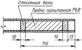 В прокаленную по всей длине фарфоровую трубку помещают пробку, пропитанную монооксидом свинца. Пробку (9) из длинноволокнистого асбеста или каолиновой ваты, предварительно прокаленных при 400 °С в течение 30 мин, готовят следующим образом: на стальную щетку насыпают равномерный слой волокнистого асбеста или каолиновой ваты и равномерно покрывают асбест монооксидом свинца. Трением двух стальных щеток обеспечивают равномерное распределение монооксида свинца по асбесту. Избыток монооксида свинца стряхивают на сите. На пропитку 100 г асбеста требуется около 100 г монооксида свинца 4,5 - 5,0 г пропитанного асбеста (каолиновой ваты) достаточно для образования пробки. С двух сторон от пробки помещают стеклянную вату по 10 мм с каждой стороны (черт. 3).