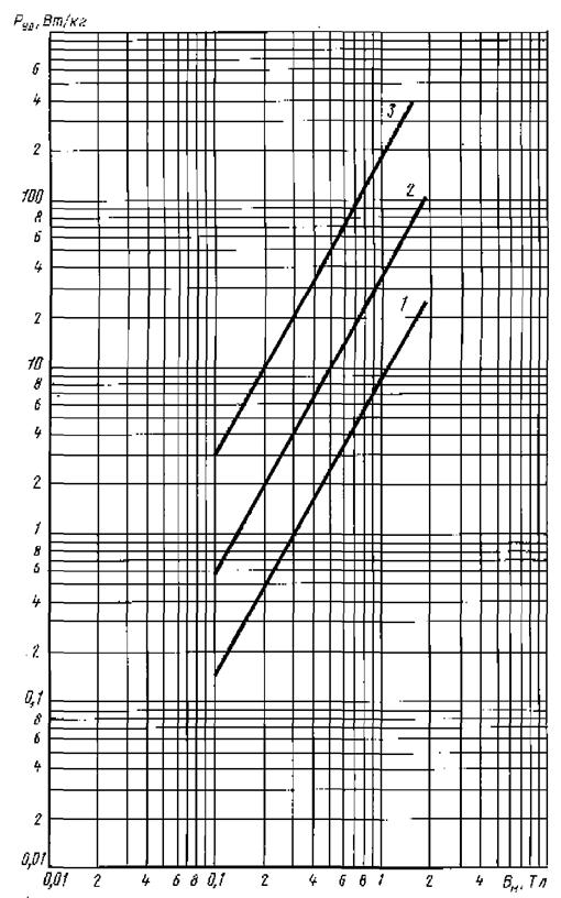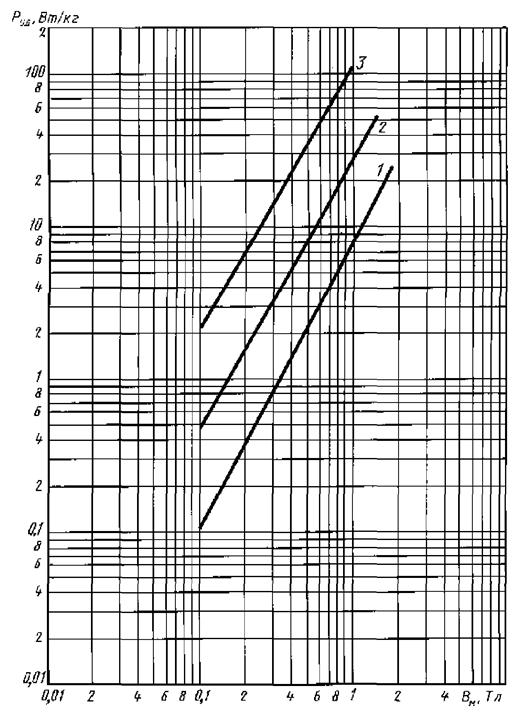 Зависимость удельных потерь от индукции для стали марки 3425 (Э360АА) при частоте: 1 - 400 Гц, 2 - 1000 Гц, 3 - 3000 Гц