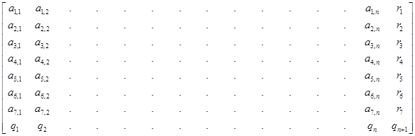 4. Знаки передаваемого блока и проверочные биты знаков образуют матрицу, где ai,j (i = 1, 2, ..., 7, j = 1, 2, ..., п) - информационные биты; q1, q2 ..., qn - проверочные биты знаков, образующие первую совокупность проверок. Знаки представлены столбцами матрицы.