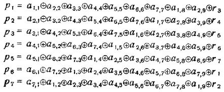 5. В конце каждой информационной строки матрицы следует добавлять один бит проверки на четность ri (i = 1, 2 ..., 7), который является суммой по модулю 2 всех предыдущих элементов строки. Проверочные биты r1, r2, ..., r7 включают в знак проверки элементов матрицы по строкам, являющийся второй совокупностью проверок итеративного кода.