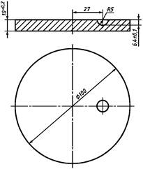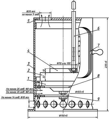 1.1. Аппарат Папок (черт. 1), в комплект которого входит диск (черт. 2) диаметром 100 мм, изготовленный из стали марок Ст3, 45 или 08 кп. В диске должно быть углубление для термометра, которое заполняется металлическим сплавом (типа сплава Вуда). Диск должен быть пришлифован к нагревательной пластинке так, чтобы нагрев был равномерным во всех точках.