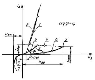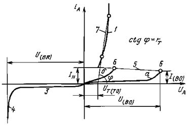 1 - характеристика открытого состояния; 2 - характеристика закрытого состояния; а - характеристика, соответствующая нулевому току управления или диодному тиристору; б - характеристика, соответствующая прямому току управления, отличному от нуля; 3 - характеристика обратного непроводящего состояния; 4 - область отрицательного динамического сопротивления; 5 - точка переключения; 6 - прямолинейная аппроксимация характеристики открытого состояния; 7 - область пробоя; Iн - ток удержания; UТ(ТO) - пороговое напряжение; rт - динамическое сопротивление в открытом состоянии; U(во) - напряжение переключения; IBO - ток переключения; UBR - обратное напряжение пробоя