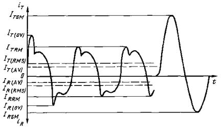 IT(av) - средний ток в открытом состоянии; IT(RMS) - действующий ток в открытом состоянии; ITRM - повторяющийся импульсный ток в открытом состоянии; IT(OV) - ток перегрузки в открытом состоянии; ITSM - ударный ток в открытом состоянии; IR(av) - средний ток в обратном проводящем состоянии; IR(RMS) - действующий ток в обратном проводящем состоянии; IRRM - повторяющийся импульсный ток в обратном проводящем состоянии; IR(ov) - ток перегрузки в обратном проводящем состоянии; IRSM - ударный ток в обратном проводящем состоянии