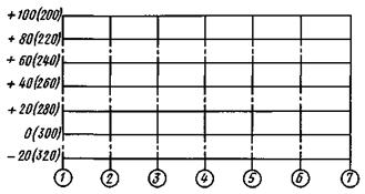 5.5. На разрезах, профилях и вертикальных проекциях высотные отметки следует указывать около сетки (черт. 16). Линии горизонтов на сетке следует изображать сплошными тонкими линиями через определенное число метров в зависимости от высоты этажа, системы разработки и масштаба чертежа. У линий горизонтов (глубины) с левой стороны чертежа следует указывать их числовые значения: без скобок - высотные отметки горизонтов, в скобках - глубины от поверхности (черт. 9).