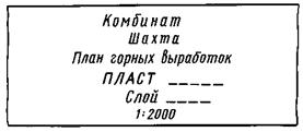 В титульной надписи следует указывать: для планов горных выработок и геологических разрезов - обозначение горизонта (например, «Горизонт - 215 м»), для приисков - номер или название полигона. Вместо слова «пласт» в четвертой строке соответственно месторождению следует указывать «залежь», «линза» и т.д.
