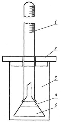 1 - бюретка с делением на 25 - 50 мл; 2 - крышка из оргстекла; 3 - стеклянный сосуд емкостью 0,5 - 0,75 л; 4 - стеклянная воронка диаметром 55 - 65 мм; 5 - испытуемая фольга (рулон высотой 30 - 25 мм, диаметром 30 - 40 мм).