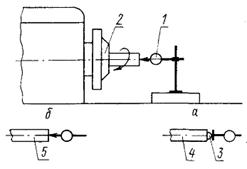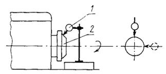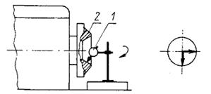 На неподвижной части станка укрепляют индикатор 1 так, чтобы его измерительный наконечник был перпендикулярен опорной торцовой поверхности шпинделя 2 в точке касания. Шпиндель приводят во вращение. Измерение производят в двух диаметрально противоположных точках. Отклонение определяют как наибольшую величину показаний индикатора. |